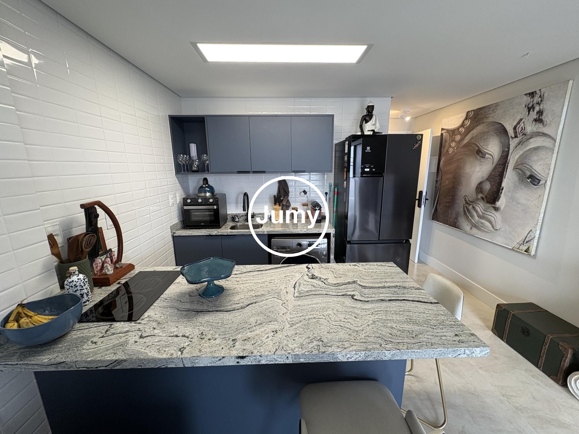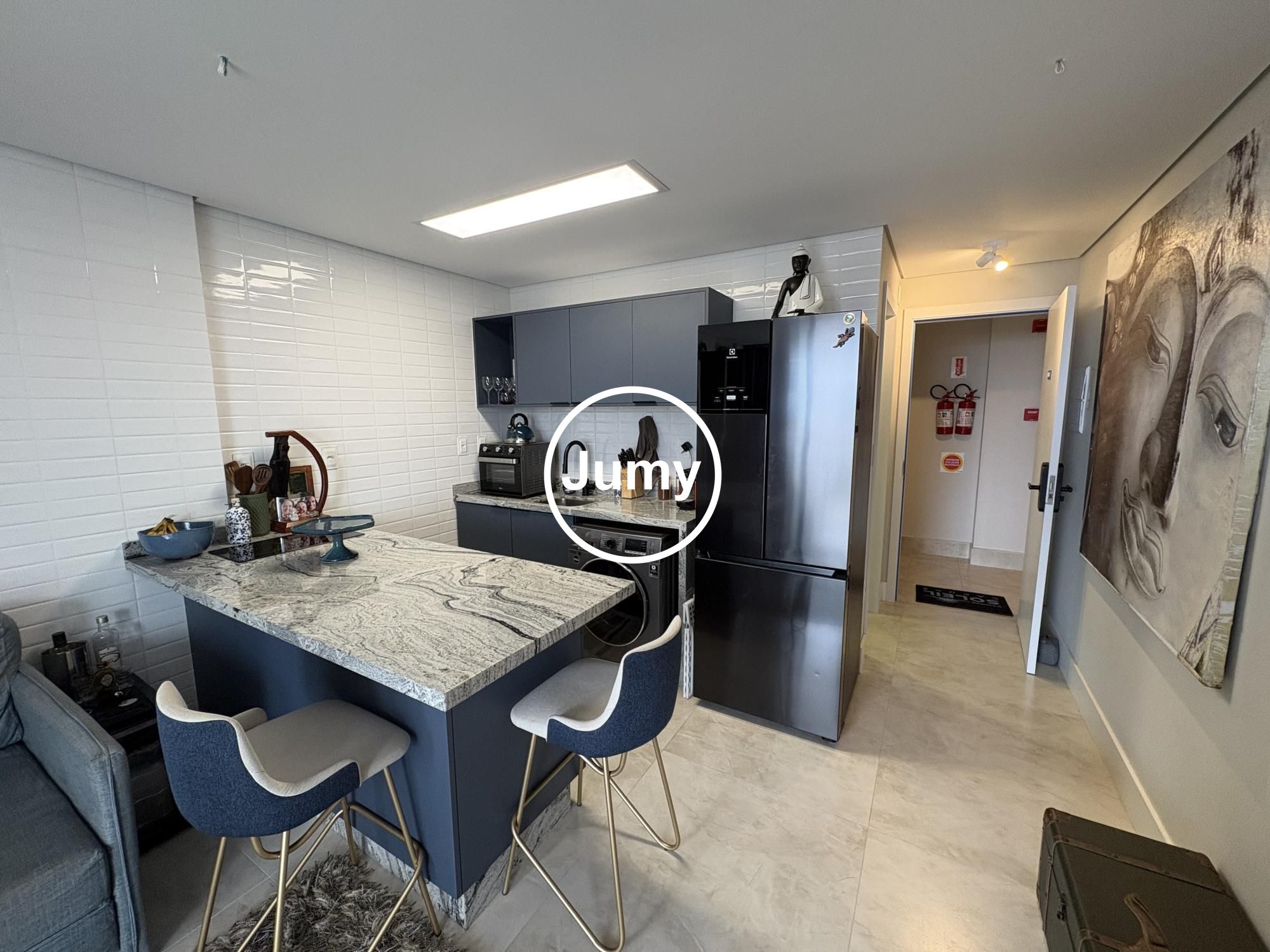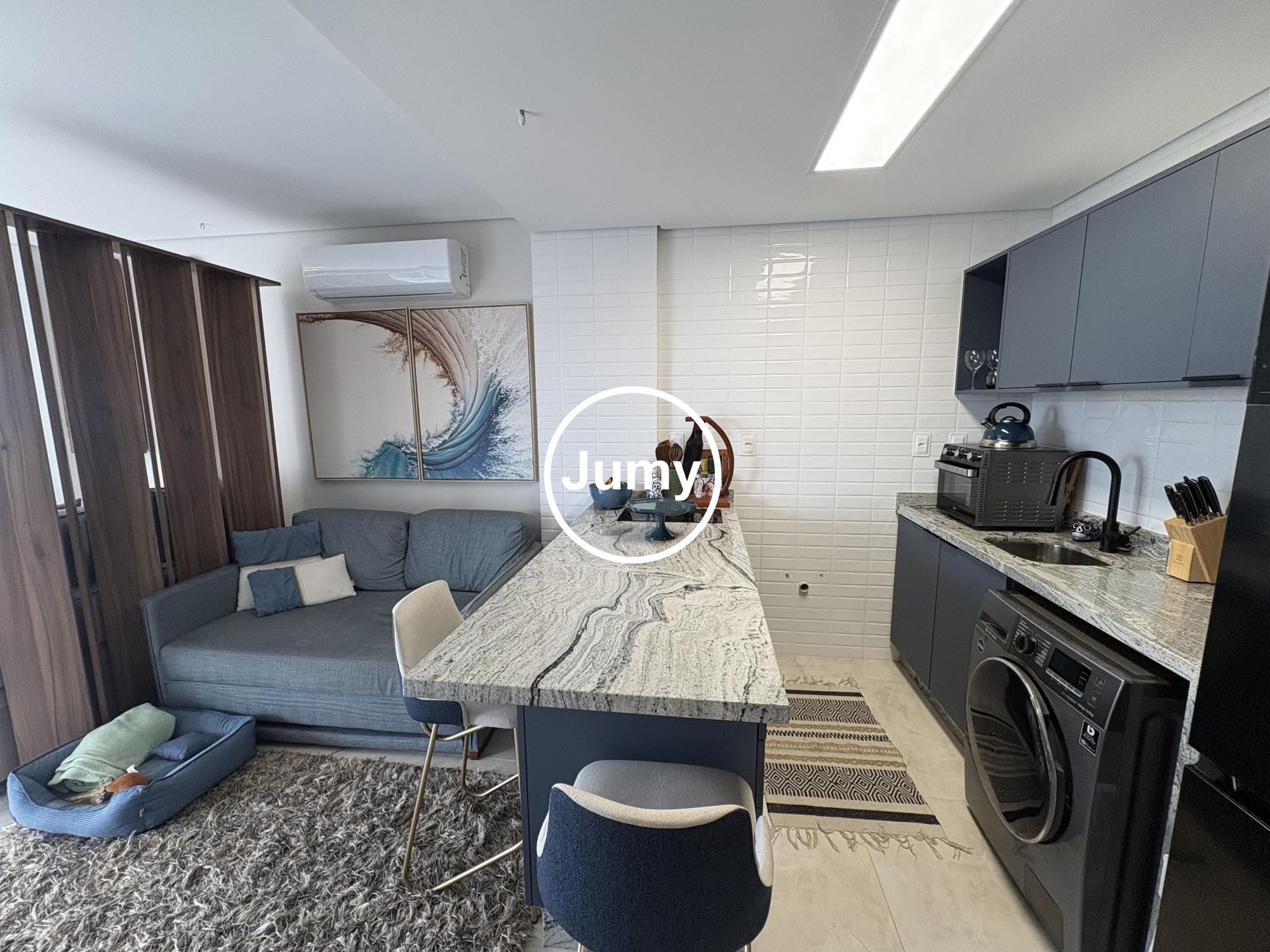 O imóvel conta com um ambiente integrado, moderno e muito bem distribuído. A cozinha é equipada com armários planejados, fogão, geladeira e eletrodomésticos, além de uma ampla bancada em granito que também funciona como espaço para refeições, integrando-se perfeitamente à sala de estar, já mobiliada e equipada com ar-condicionado.